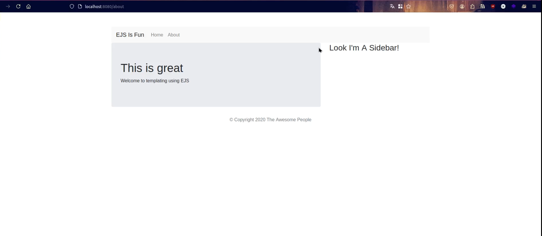 Ora, invece, creiamo il file about.ejs, aggiunge una barra laterale di Bootstrap, giusto per differenziarlo dall’altro: