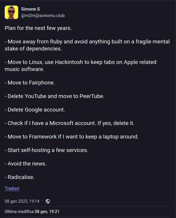 leggendo il blog di cedmax ho recuperato questo Toot che in questo periodo sento vicino a me (a dire il vero tutto il profilo di @m2m sento molto vicino a me e non nascondo che alcune cose che scrive me le salvo in locale insieme ai miei piani per i prossimi anni).