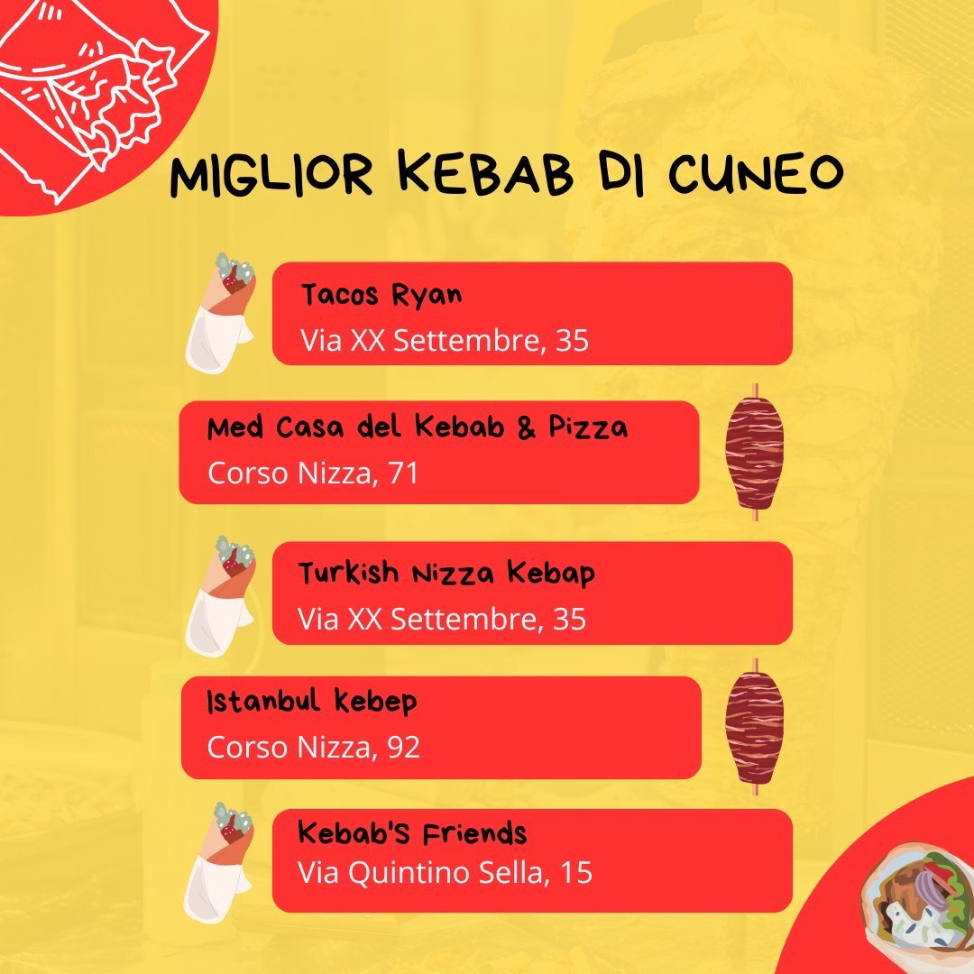 Se siete di passaggio per Cuneo, è ora di pranzo ed avete voglia di un kebab ecco un immagine dei migliori kebabbari di Cuneo, aggiornata a dicembre 2024.